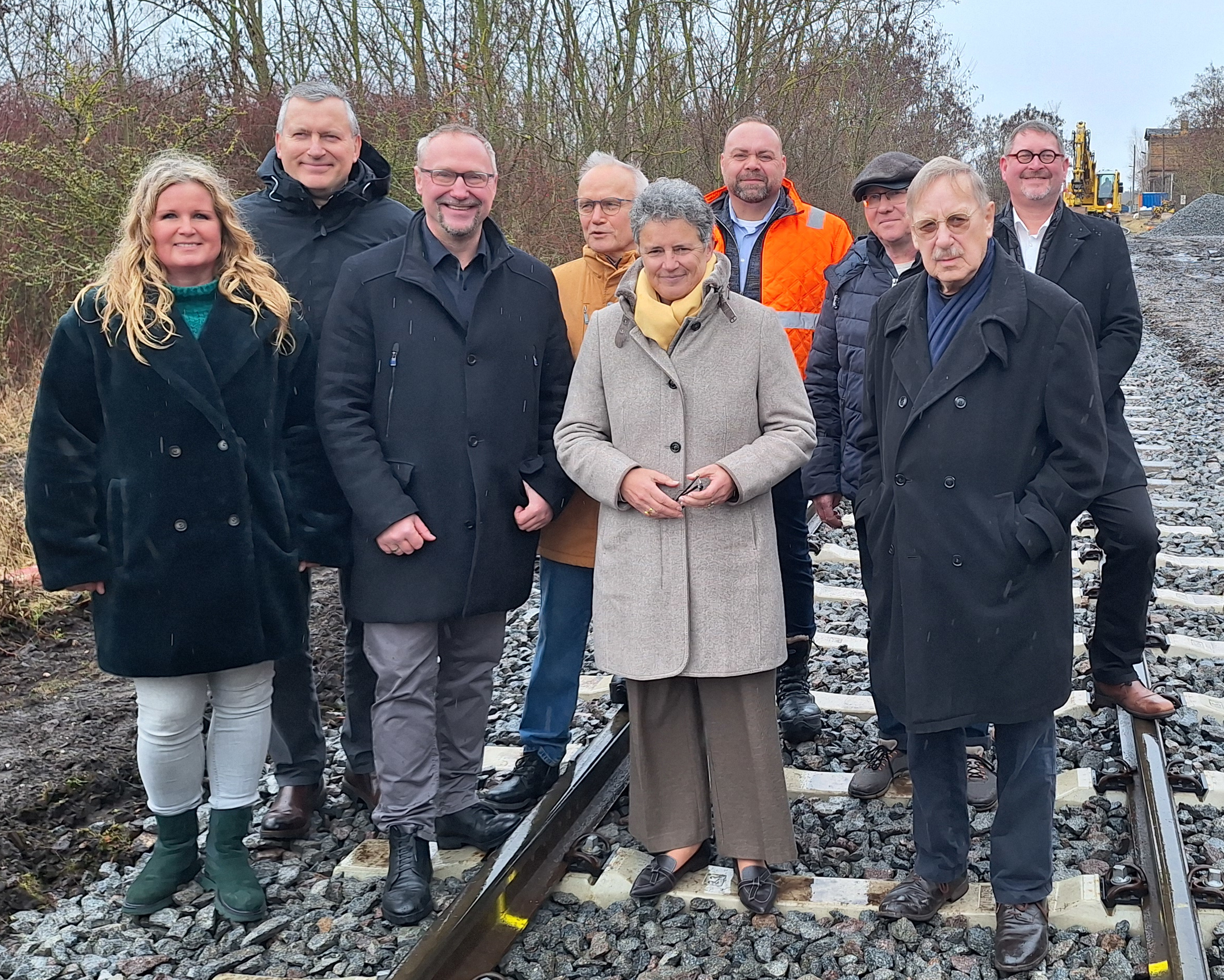 Fördergeldgeber für das Reaktivierungsprojekt der Eisenbahnstrecke Köthen – Aken: (Mitte) Sachsen-Anhalts Verkehrsministerien Dr. Lydia Hüskens, (rechts) BRE-Geschäftsführer Gerhard J. Curth, (links) Vertreter des Landkreises und (3.v.l.) Akens Bürgermeister Jan-Hendrik Bahn sowie (hinten 2.v.r.) der Geschäftsführer des Hafenbetriebs Aken, Jan Schwärzel.